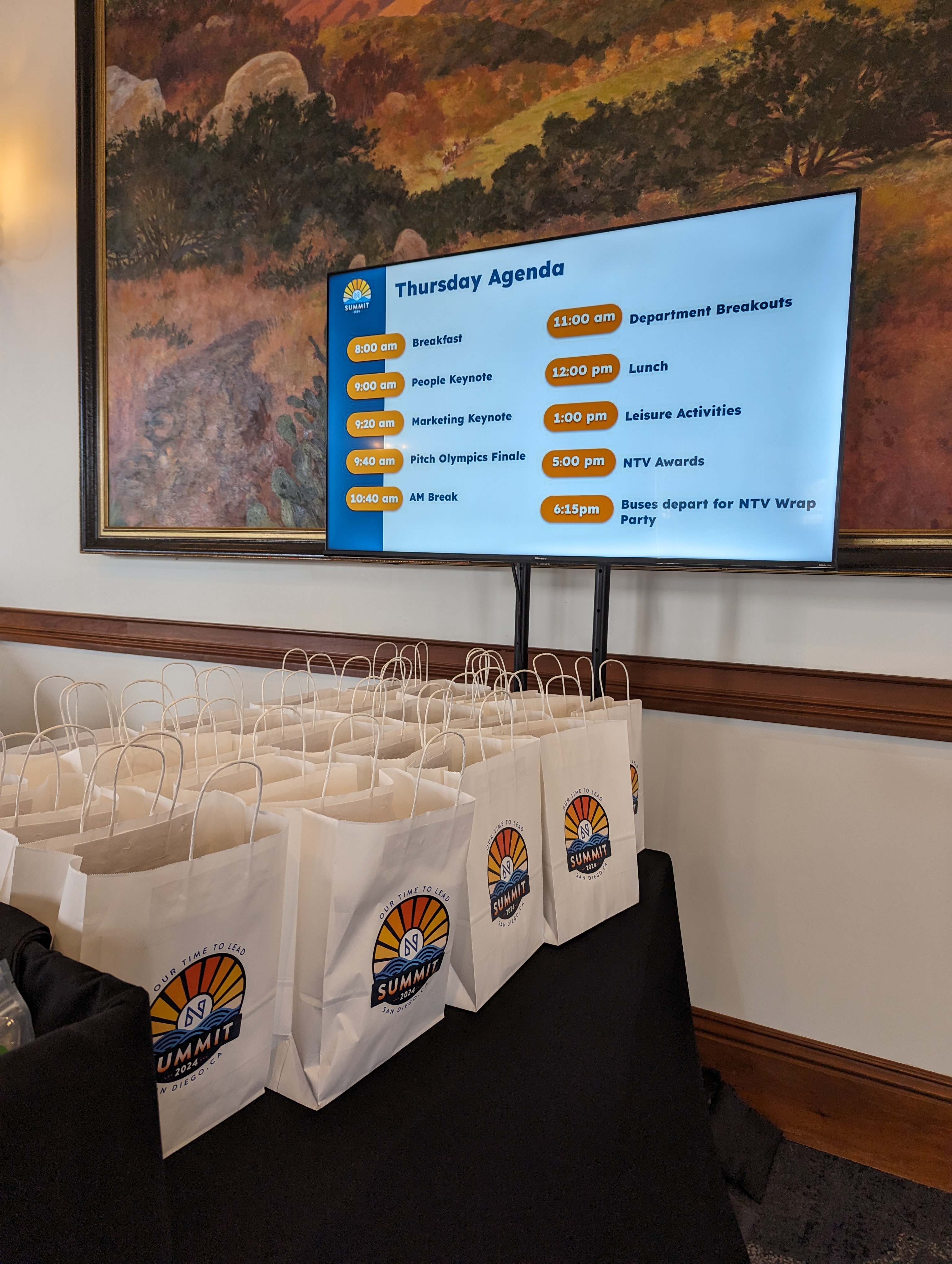 In 2021 and 2024 I was tasked with creating national all-hands summit branding packages for two different companies. Both events required a full range of print and digital collateral creation outside of just the primary logo including art direction, trade show booth visual packages, custom powerpoint decks, event brochures, event grounds signage, speaker intro videos and customized web portals. Strangely enough, both events took place at the Omni La Costa resort in Encinitas, California.