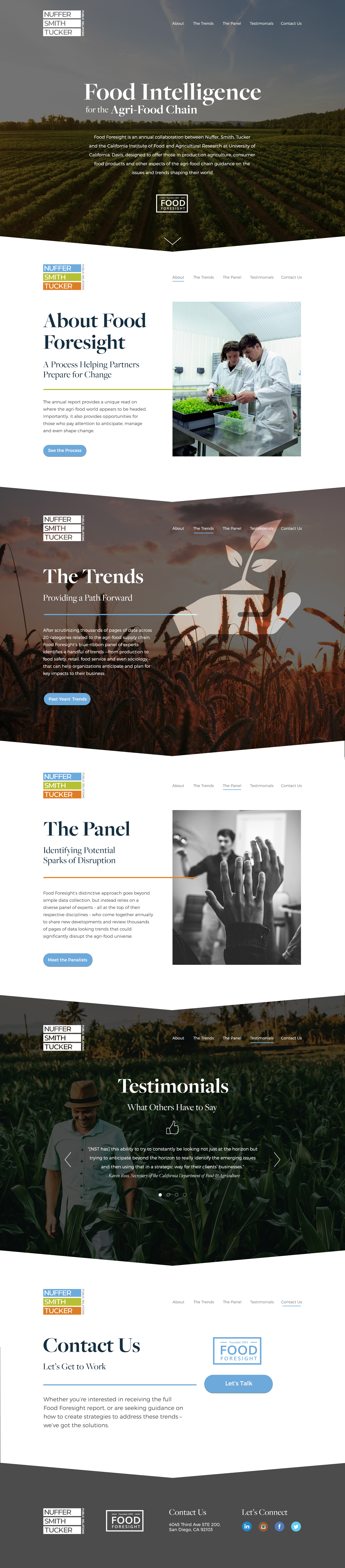 I developed this landing page and annual report cover spread concept for Nuffer, Smith and Tucker Public Relations as part of a “Design Challenge” I was asked to perform in order to be considered for a Senior Designer role I applied for. Said landing page and annual report was based off of provided content, around an initiative to bring awareness to their agricultural trends and insights program. Using only limited provided copy and stock photos I sourced from adobe stock, I developed the look and feel using a mixture of NST established branding and my own UI/UX and layout design ideas. A main goal; tie-in this concept directly with the annual report portion of the challenge and create visual cohesion between the two. Although I wasn’t selected for the role, I feel these concepts showcase how I can be a versatile and creative multidisciplinary designer with little to no art direction and very minimal content.